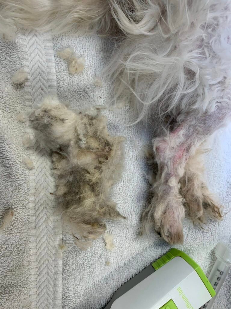 As Paddy was examined more closely, the full extent of his injuries became clear—and deeply disturbing. The matting on one of his legs had tightened so severely that it cut through the skin and muscle, reaching all the way down to the bone.
