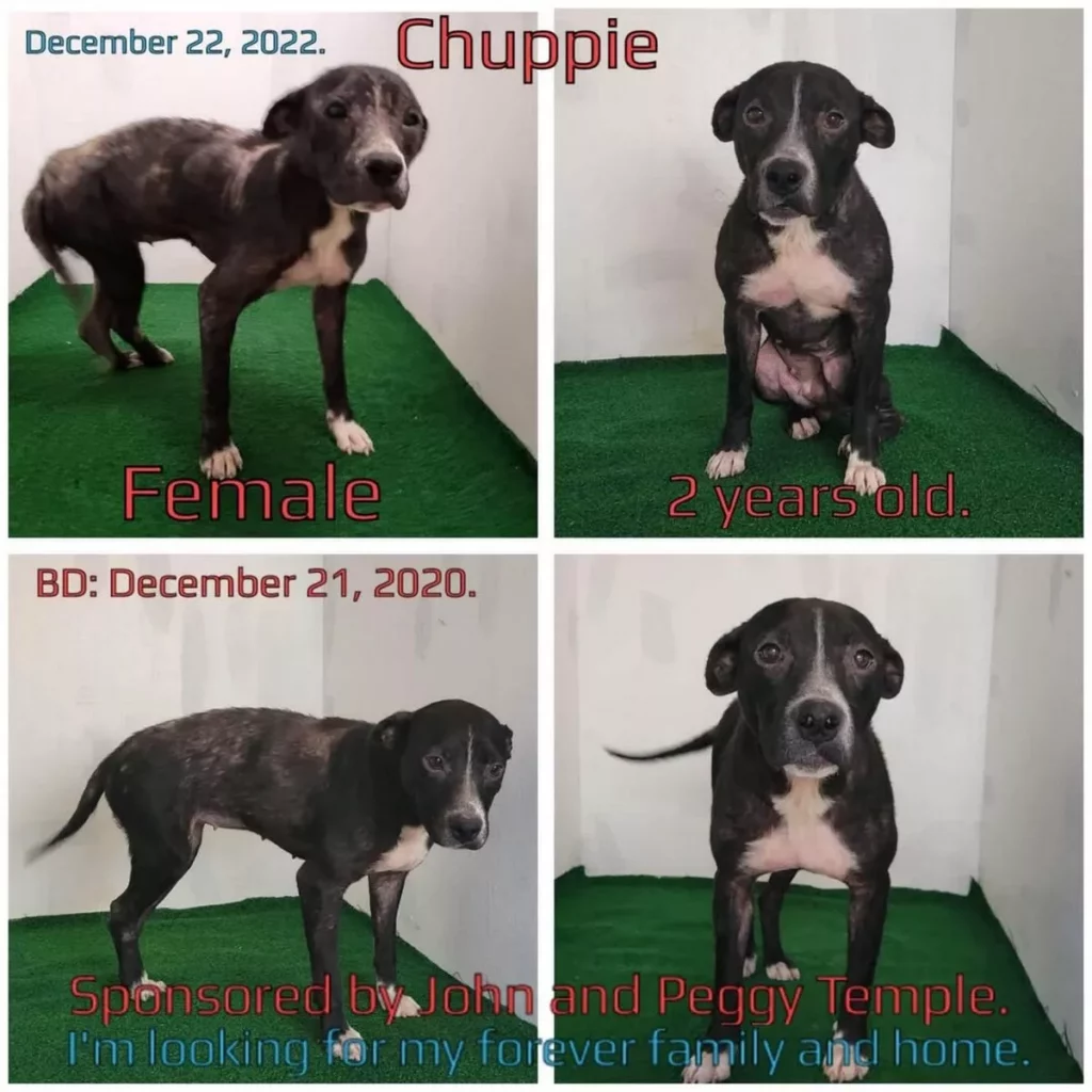 Her story began in December 2022, when she was found injured and alone in a ditch. Starving and weak, she was barely able to use her back legs. Her ribs were visible, her fur was falling out, and it was suspected she had been hit by a car. The shelter team named her Chuppie — after an anime character known for resilience — and they quickly learned just how strong and special she truly was.
