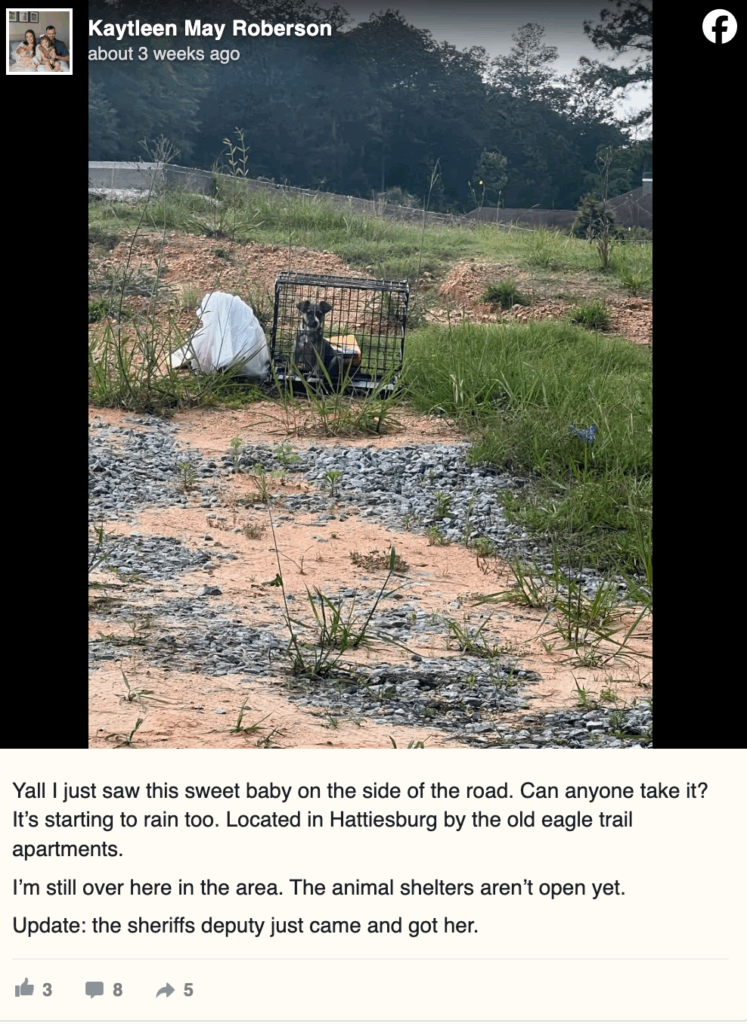 “I grabbed an Uber, and on our way out, I looked to my right, and I noticed there was a kennel out here, and I saw a little puppy’s head pop up,” Speer recalled in an interview with WDAM. Without hesitation, the two women pulled over to investigate.