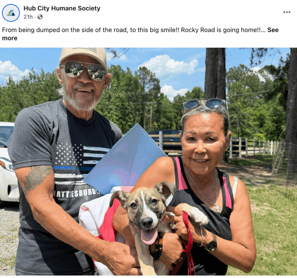 “From being dumped on the side of the road, to this big smile — Rocky Road is going HOME!!”