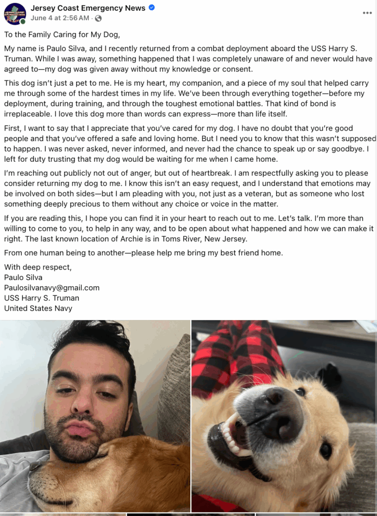“I am reaching out publicly not out of anger, but out of heartbreak,” Silva wrote. “Please consider returning my dog to me… not just as a veteran, but as someone who lost something deeply precious without any choice or voice in the matter.”