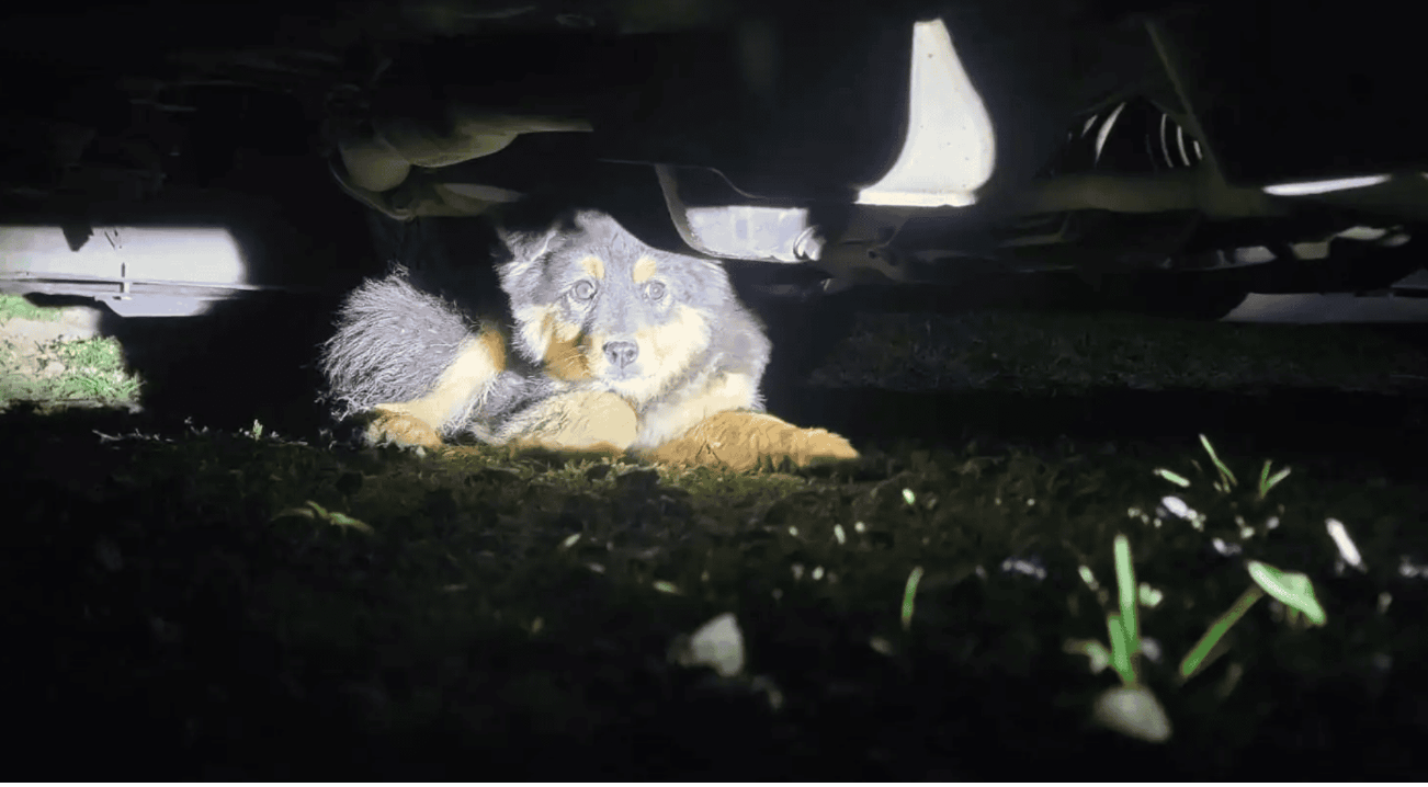Curiosity piqued, Kaitlyn ventured out to investigate the source of the commotion. There under the shelter of her car, she discovered a frightened, fluffy pup peering back at her with wide eyes.