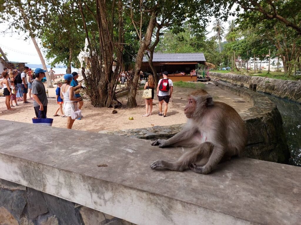 A macaque at Monkey Bay, where feeding wildlife is strictly prohibited to protect their health and natural behavior.(Photo credit: Khaosod English via Facebook)
