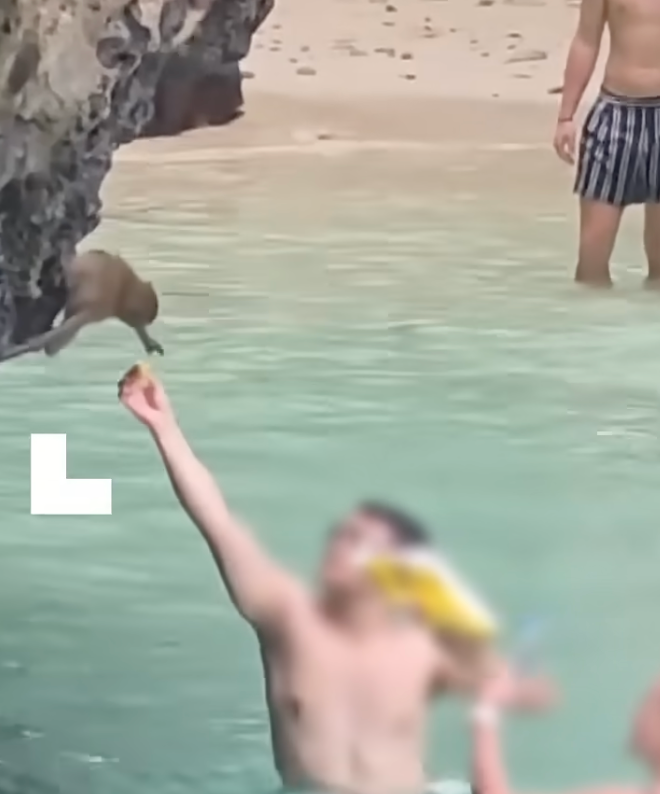 Tourists at Monkey Bay, where feeding wildlife is strictly prohibited to protect the fragile ecosystem.(Image by @TheNationThailandonline via YouTube.)
